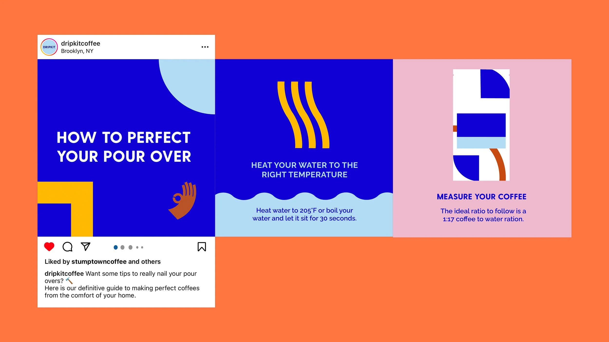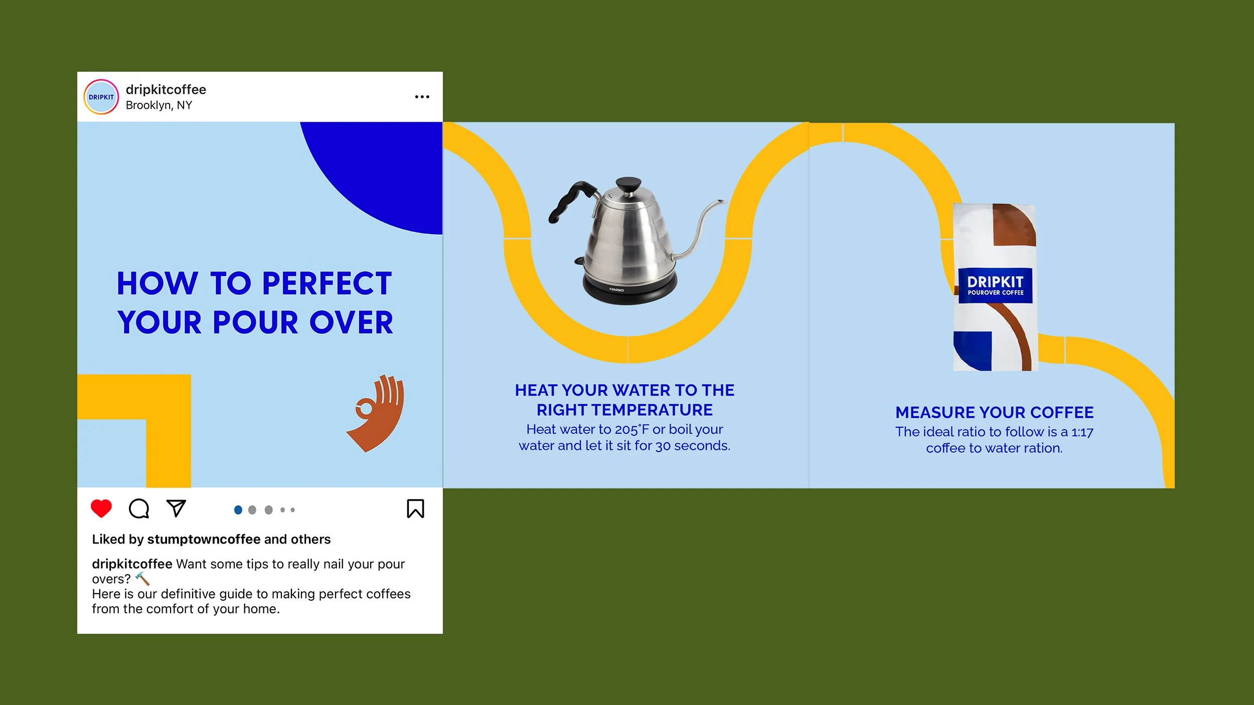 Dripkit is a company that provides coffee lovers with great coffee, made easy. Dripkit engages with its audience through social media platforms such as Instagram. These social media graphics describe how coffee lovers can create the perfect pour over.