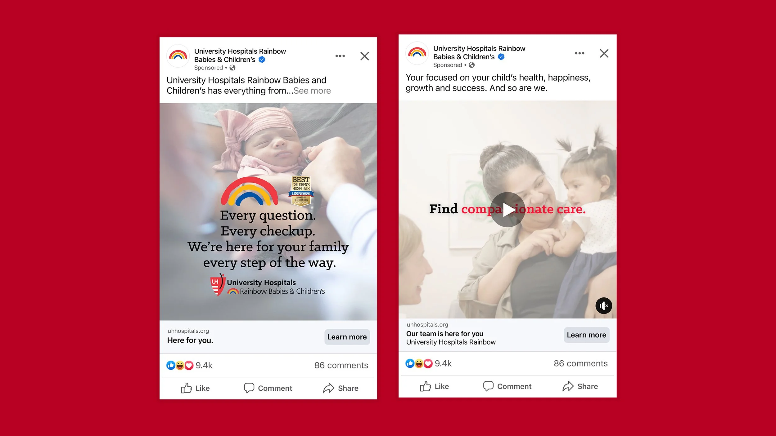 Within the health care network is Rainbow Babies and Children’s (RBC), a full-service children’s hospital and academic medical center. Increasing brand awareness among growing competition from other children’s hospitals and pediatric care providers was the primary goal of the campaign. RBC was positioned as a trusted and comprehensive family provider, emphasizing its continuum of care for young families and expecting parents in local communities. The creative testing strategy included GDN, display ads, static and video paid social ads.
